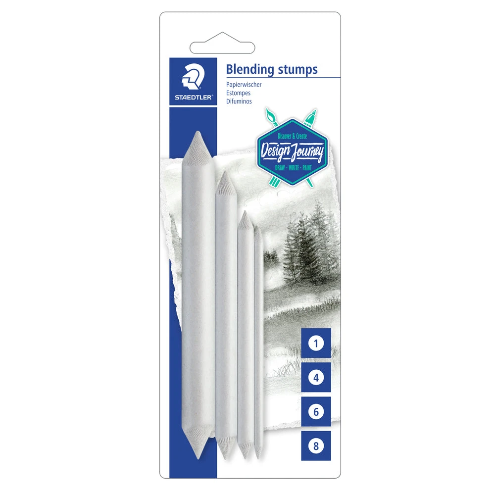 Staedtler Blending Stump Set for pastels, graphite and charcoal. Artist blender pack of 4 assorted sizes. Everyone from beginners to professionals will appreciate the quality, smoothness and shading capabilities of this set of blending stumps. Easily achieve soft edges, smoothly transitioned blends, subtle fades, create translucent, misty effects, and burnish your backgrounds.