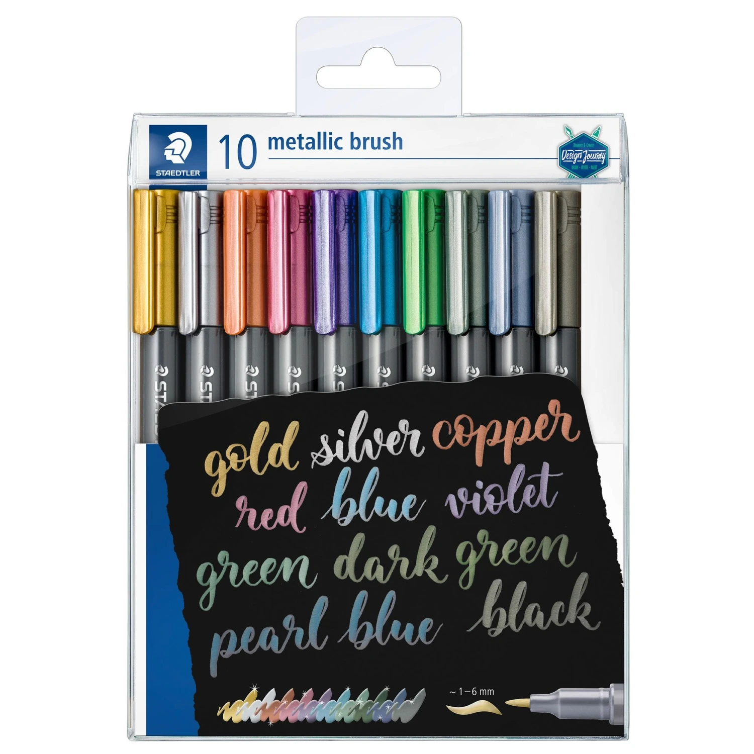 High quality 10 assorted coloured metallic brush pens are ideal for opaque writing and decorating on light and dark paper as well as on card. These pens are perfect for scrapbooking and hand lettering greeting cards, journals and adding an effect to your art work. They are easy to remove from glass, mirrors and most smooth surfaces with a damp cloth.