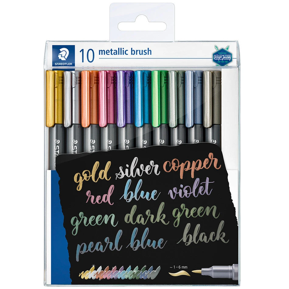 Pack of 10 Staedtler Design Journey Metallic Brush pens in assorted colours. Perfect for opaque writing and decorating on both light and dark paper and card. Ideal for scrapbooking and greeting cards. Doesn’t require pumping or shaking. Can be easily wiped off smooth surfaces like glass and mirrors using a damp cloth. 1-6mm line width.
