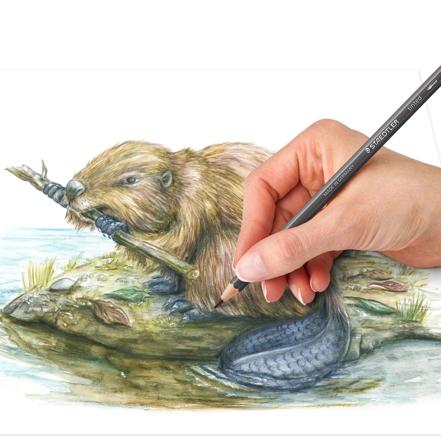 Two completely different effects with one pencil.When used dry it has soft and subtle nature colours with a dark graphite character, by adding water they awake in a rich and living intensity while still staying muted.