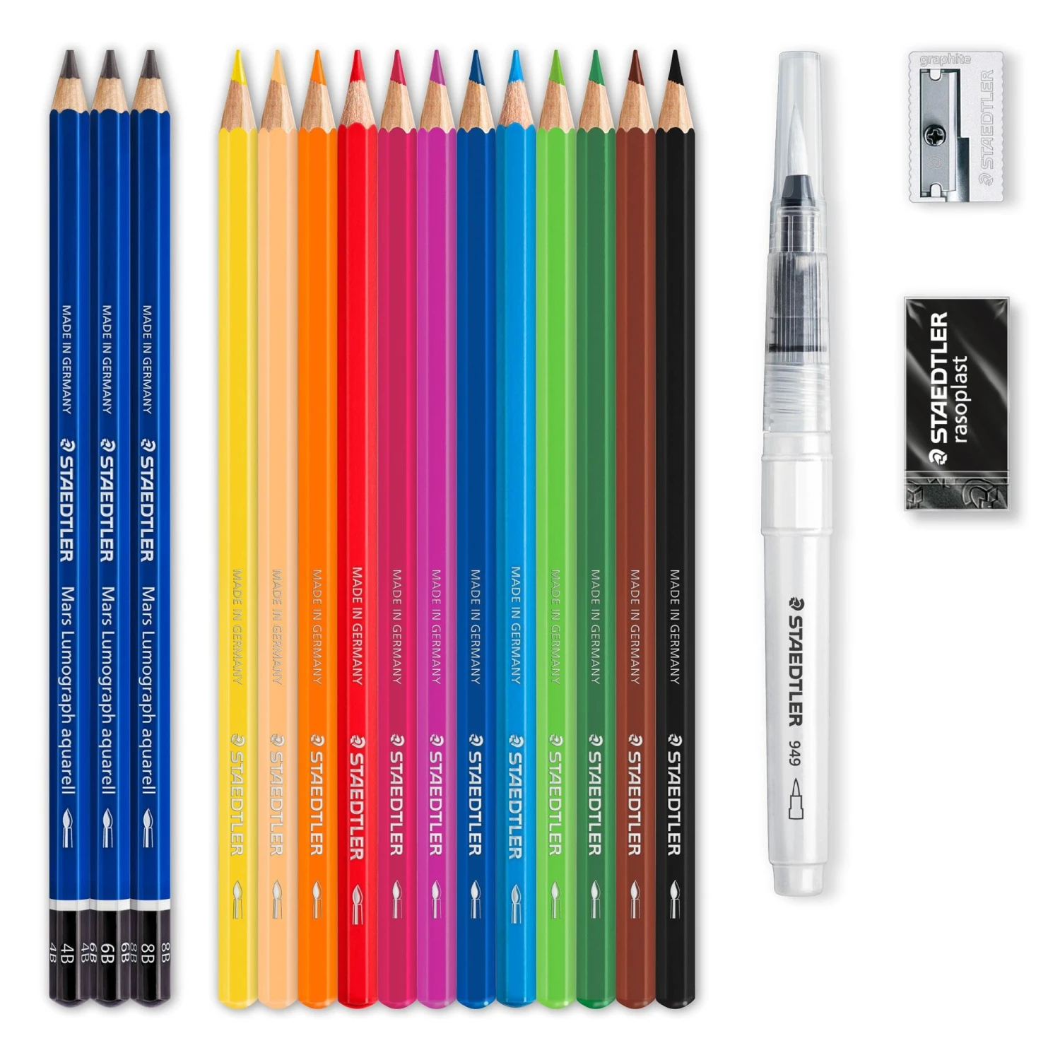 The set contains: 3 x Mars Lumograph aquarell blacklead pencils (4B, 6B, 8B), 12 x watercolour pencils in assorted colours, 1 x water brush (M), 1 x black art eraser, 1 x plastic sharpener.