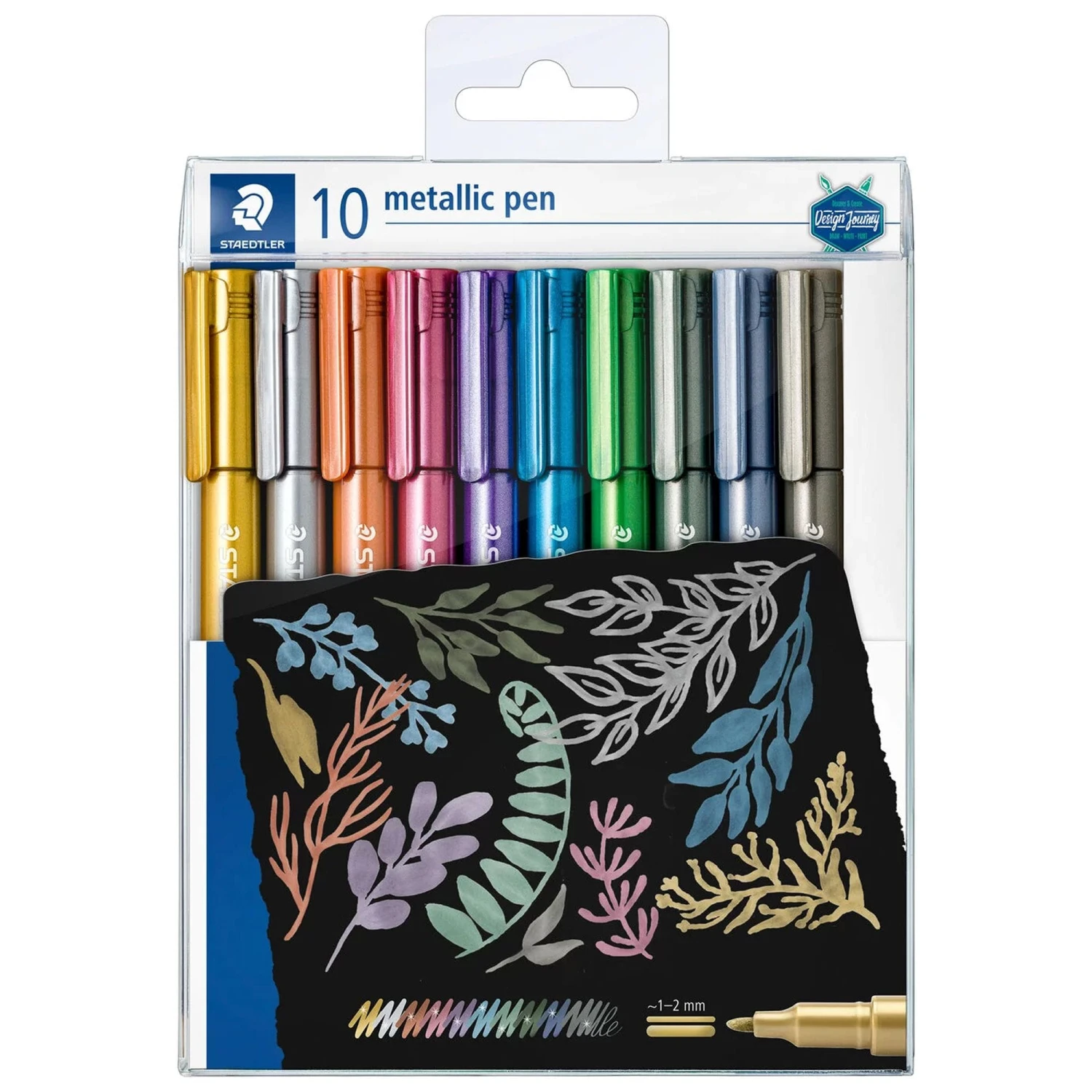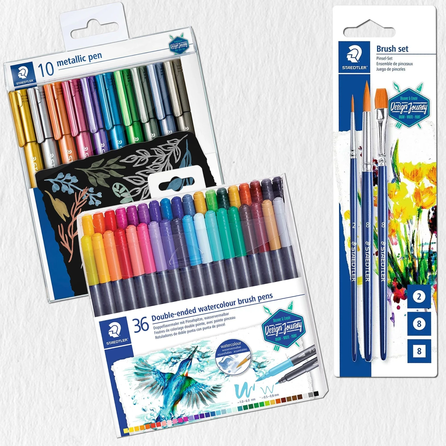 Bundle contains a Staedtler set of 10 metallic pens, 36 dual tip watercolour brush pens, and a Design Journey brush set