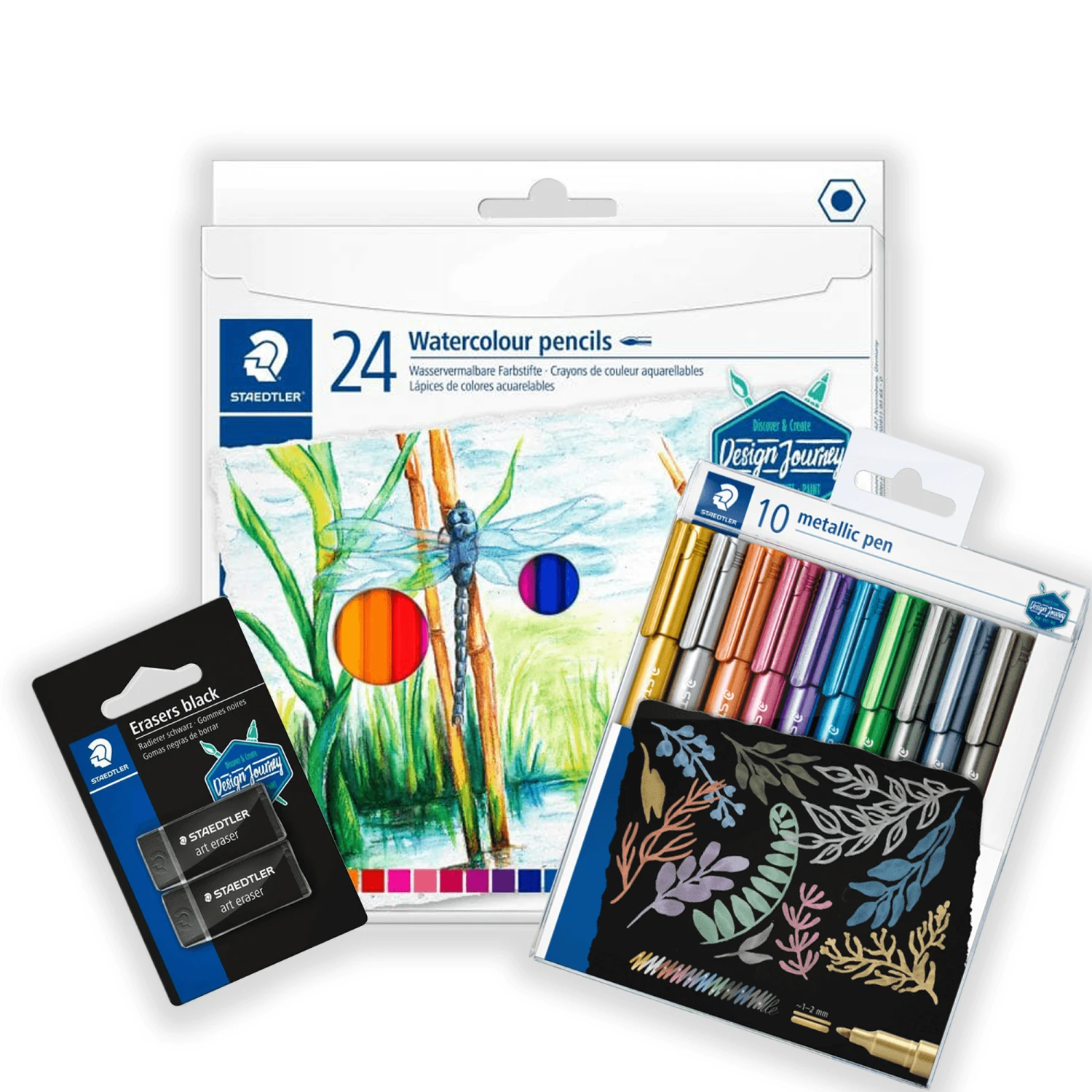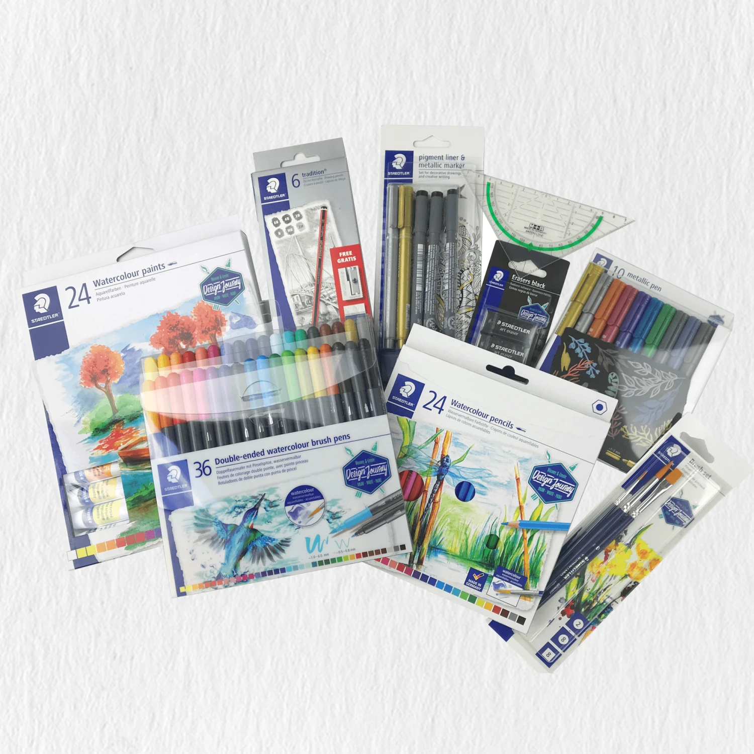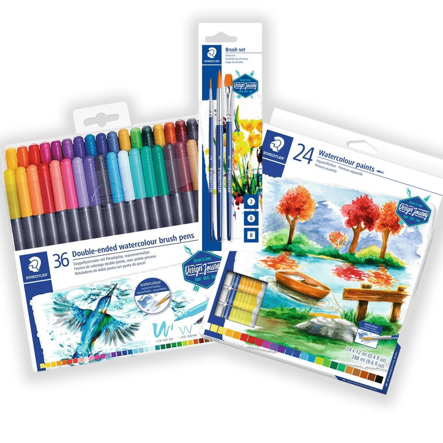 - Different effects with watercolour mediums: a misty effect with watercolour paints, colour gradients with watercolour brush pens, and textures with watercolour pencils