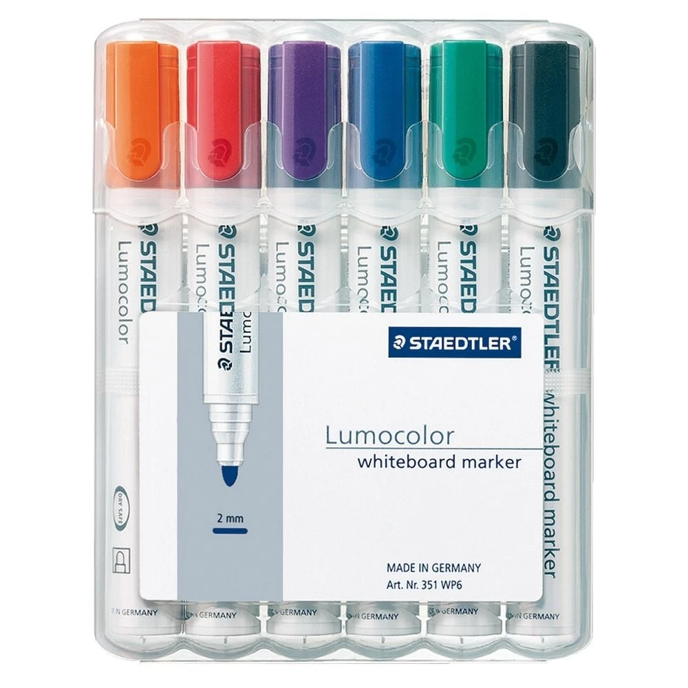 Staedtler Lumocolor whiteboard markers are high quality, durable whiteboard markers. The ink can be dry-wiped from whiteboards and surfaces like glass and porcelain without leaving a trace. The ink is fast-drying and low odour and also benefits from being both xylene and toluene-free. The pens come supplied in the practical and elegant stand-up Staedtler box. With the Staedtler box you simply open, stand it up and start writing. The ideal Staedtler box is so practical and just as ecologically efficient: Without the need for additional external packaging, it serves as a practical storage box and clever pen holder at the same time.