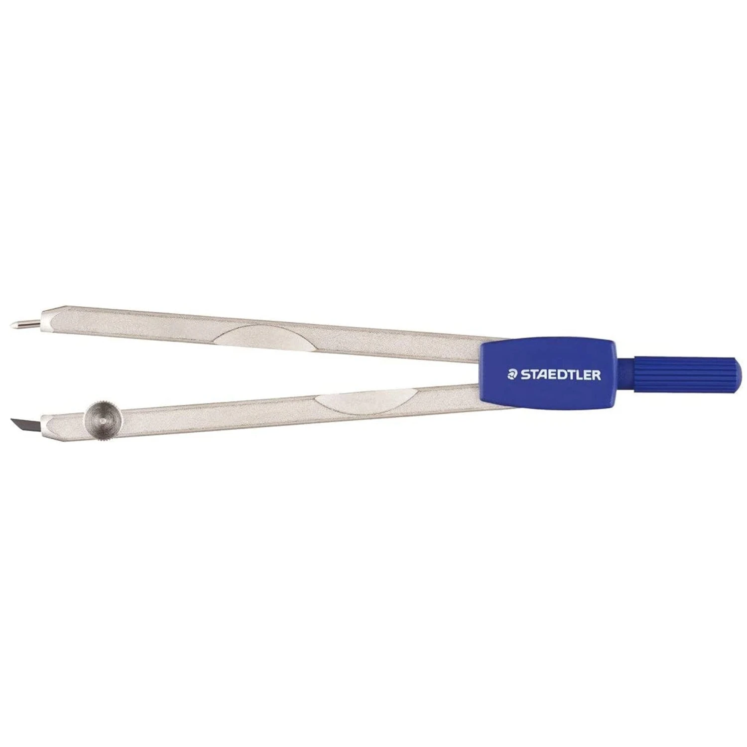 A quality precision compass from Staedtler. This comes in a plastic wallet with a small spare lead box. The leads are approx 15mm long. The compass is 128mm long and can be used to create cirles with a maximum approximate diameter of 340mm. The compass features a friction head for smooth radius setting.