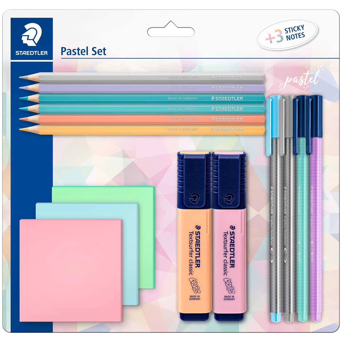 - Texturfer set including 6 colouring pencils, 3 post-it note packs, 2 Textsurfer classic highlighters and 4 Triplus fineliners, in assorted pastel colours