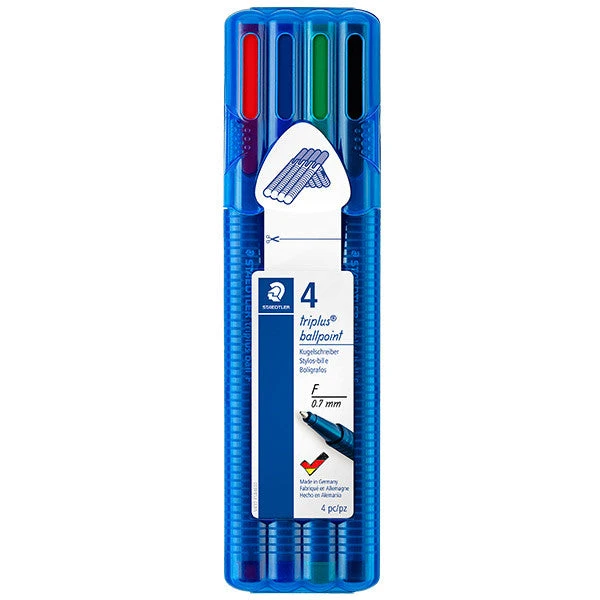 Staedtler triplus Ball Pen 437 set of 4 assorted colours. Ergonomic triangular barrel for effortless, fatigue-free writing.