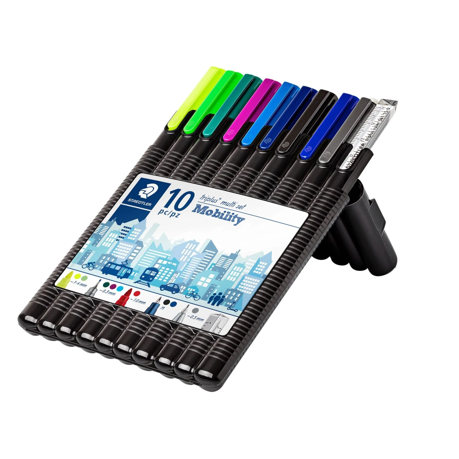 The Triplus Mobilty Multi Pen Set in a reusable stand-up desktop box contains 10 triplus pens, pencil and ruler this is the perfect set for on the go working or for home and office.