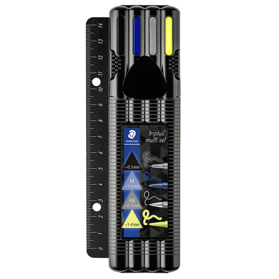 Contains a ruler, a triplus fineliner 334 in black, a triplus ballpen 437 in medium blue, a triplus micro mechanical pencil 774 with 0.5mm lead and a triplus textsurfer highlighter in yellow.